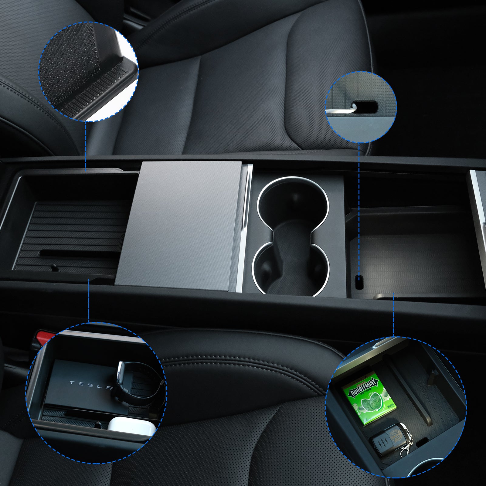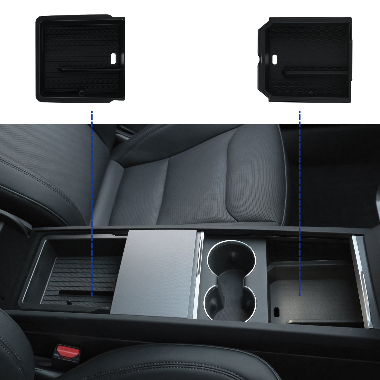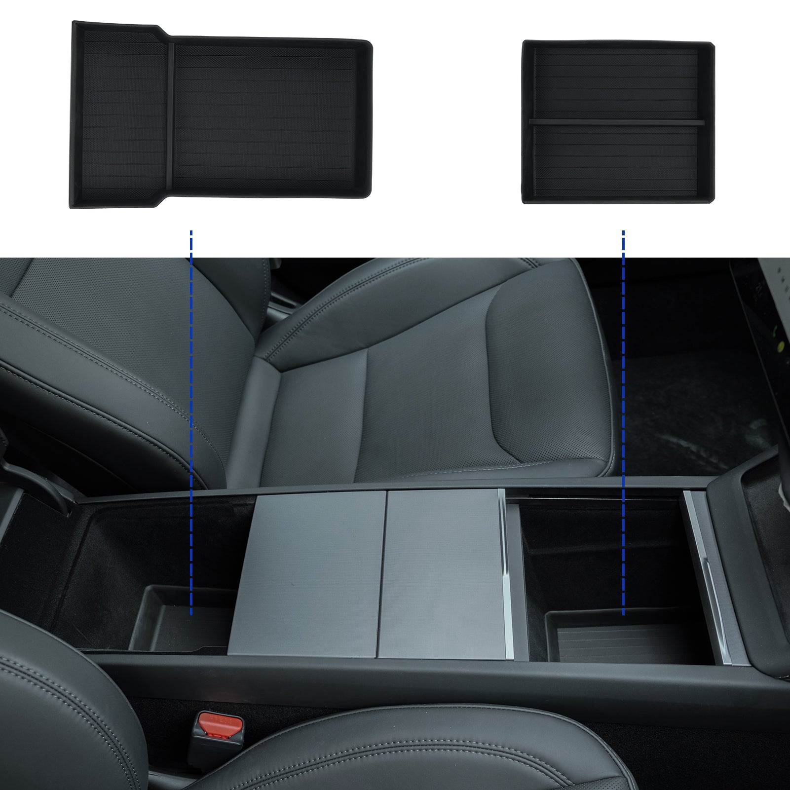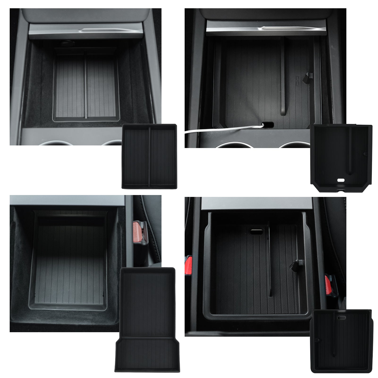 - 【4PCS Interior Accessories Set】Exclusive design for the latest 2024 2025 Tesla Model 3 Highland, custom fit, will not affect the original function of the vehicle, the key to keep the center console clean.1PCS center console tray,1PCS armrest storage box tray,1PC center console bottom tray,1PC center armrest console bottom tray.