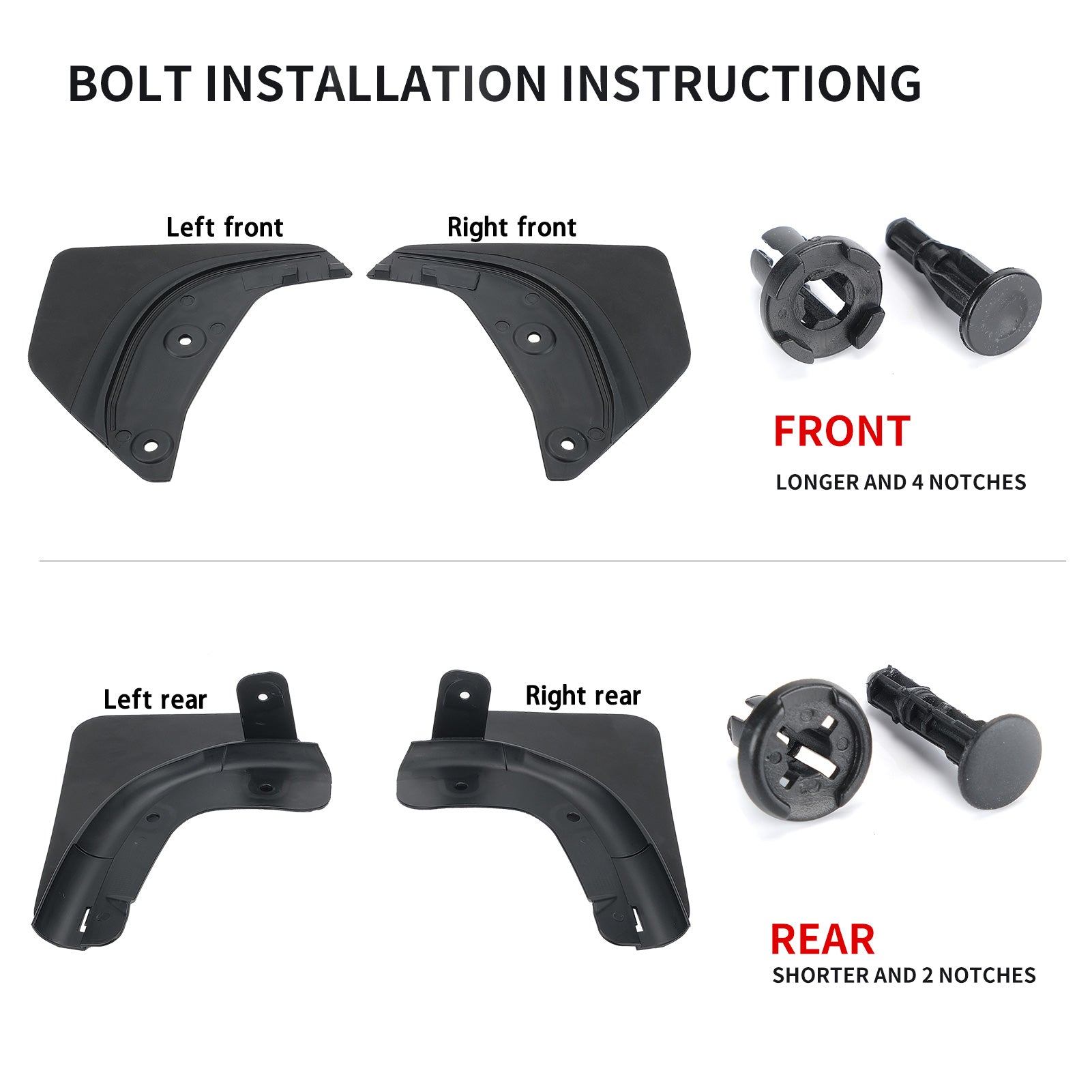 【Installation without drilling】Fast and simple, directly installed in the original hole position on the car. No need to punch holes. Note: When installing the rear mud flaps, you need to use the 2 screws of the original car. We have an installation video to provide. If you have any questions, please feel free to contact us via Amazon email.