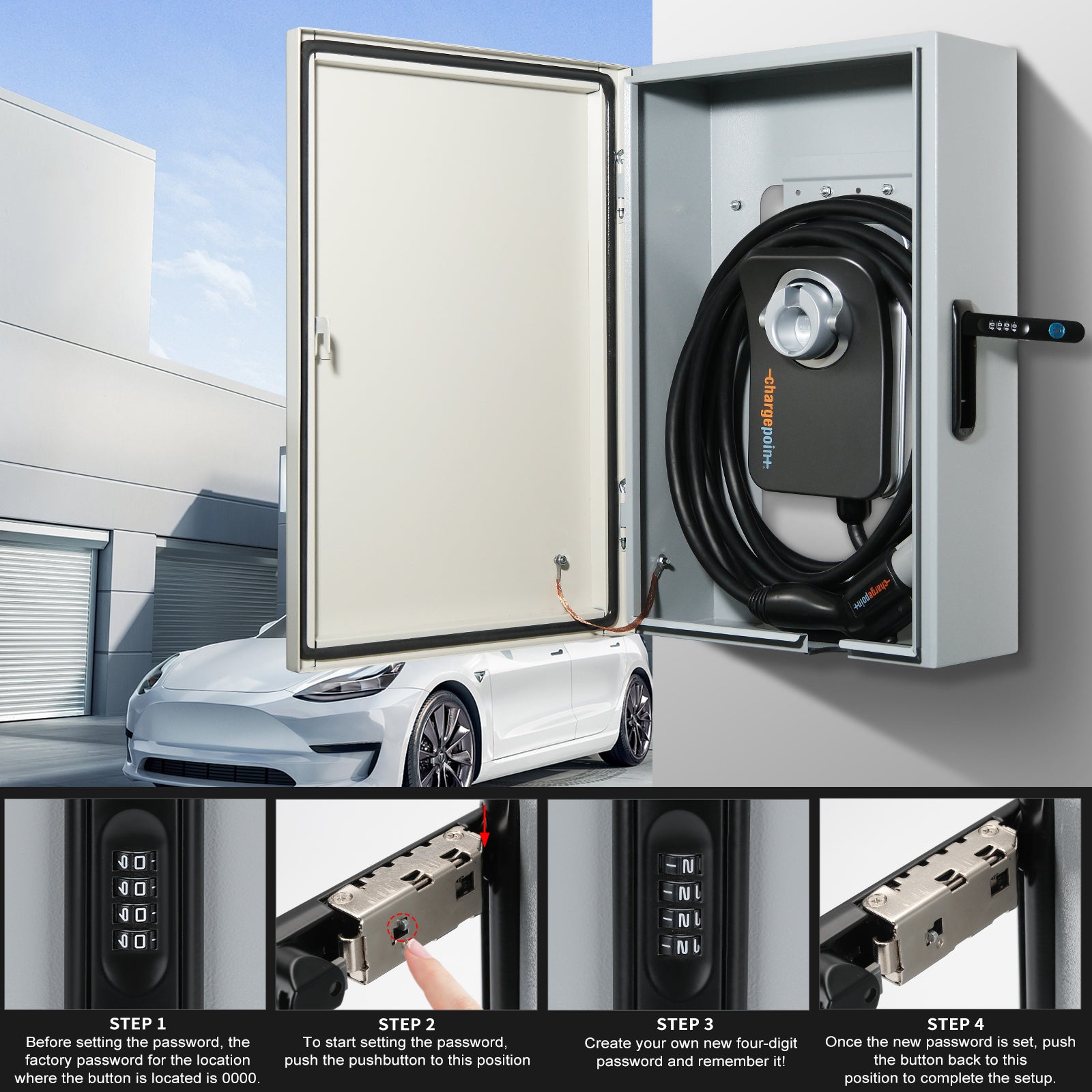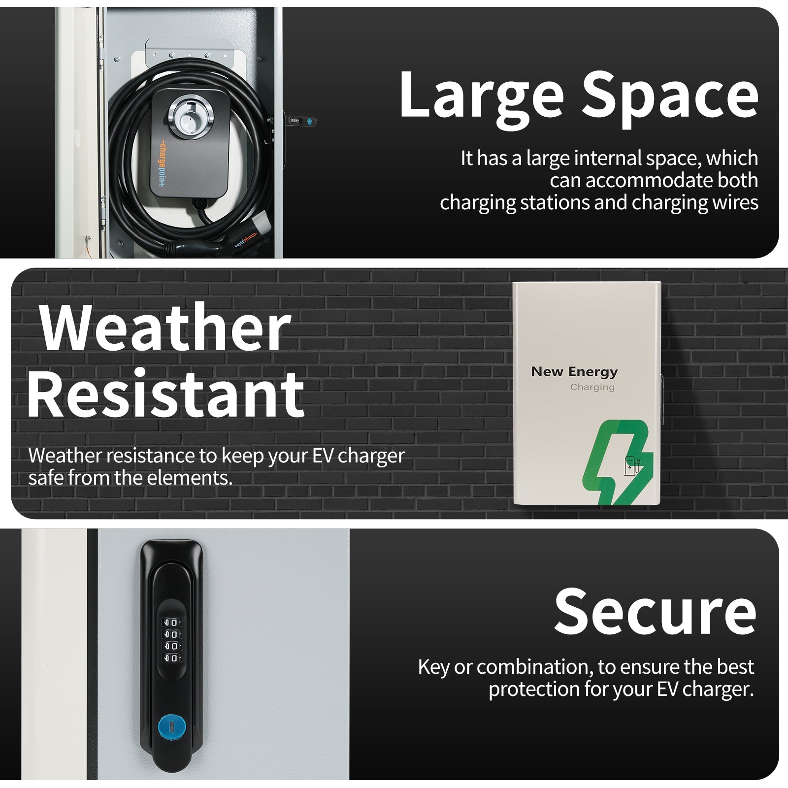 - 【Design】The protective box is installed on the wall - mounted charger without removing the charger from the wall. It is equipped with a password - type mechanical lock to ensure that the charger will not be lost.